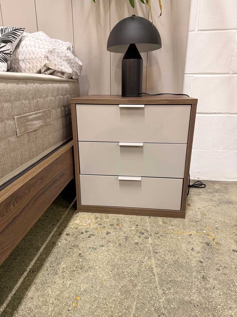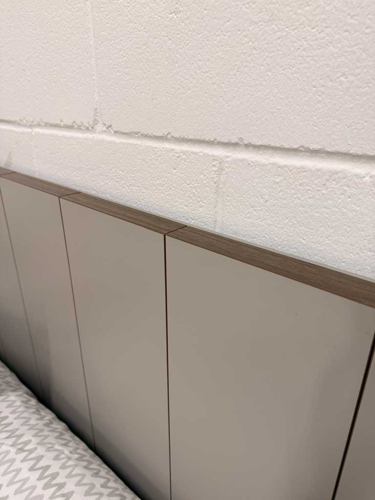 Cabezal de 261 cm con dos mesillas de 50 cm y bancada en Nogal y gris. 1200€